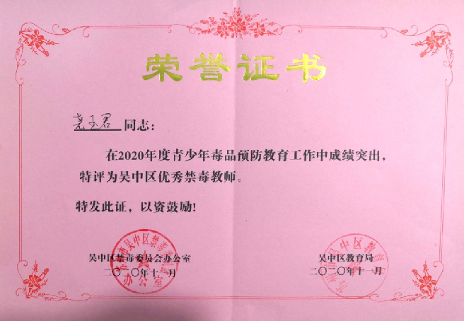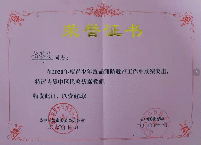 优秀禁毒教师 来源: 发布时间:2021-01-05 17:00:03 浏览次数: 次 【字体:小 大】 祝贺甪直甫里中学俞静芳、尧玉君两位老师获得2020年度吴中区青少年毒品预防教育工作优秀禁毒教师。 分享到: 【打印正文】