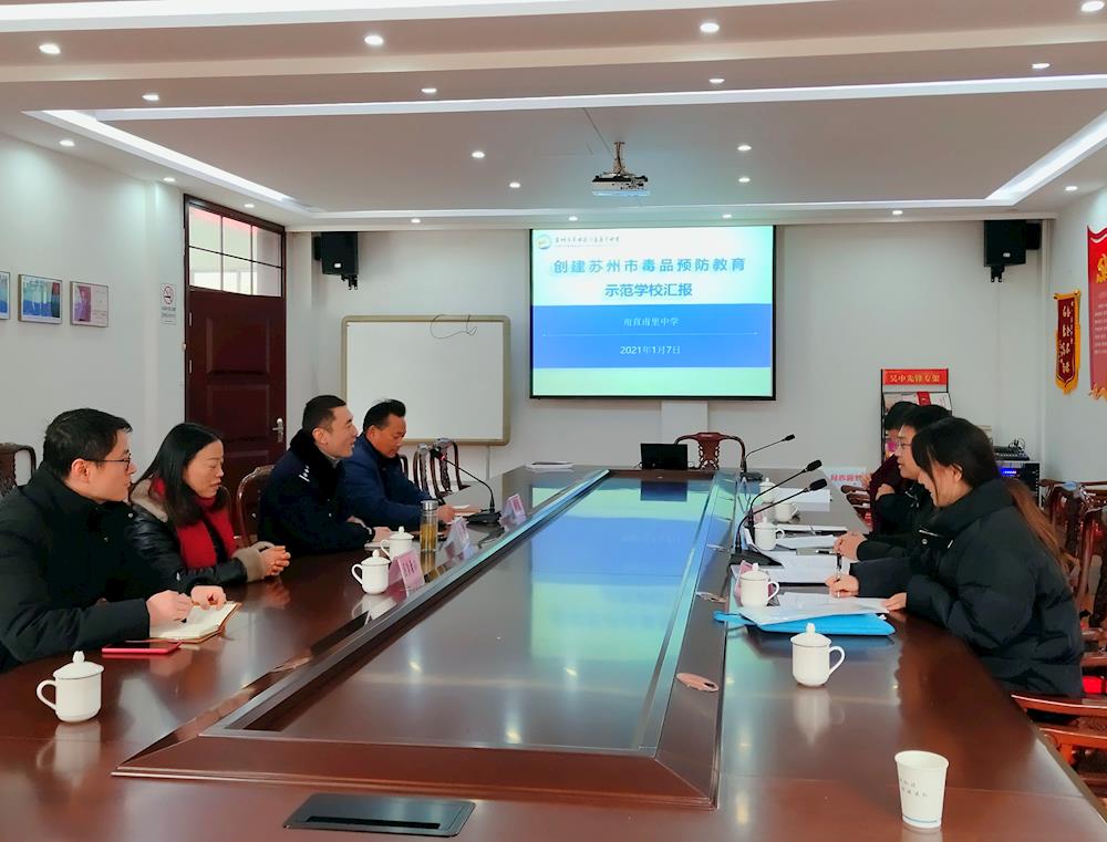 2021年1月7日上午,苏州市禁毒办苏军队长携社会化办公室袁德成、庄美娟和陆臻四位毒品预防教育示范校考核组专家,在吴中公区禁毒办的陪同下,来到甫里中学,进行2019-2020年度“苏州市毒品预防教育示范学校”的评定工作。