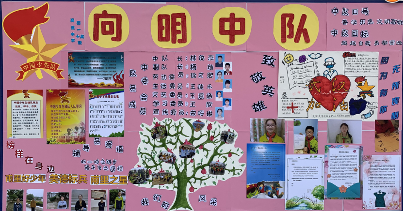 创新之处:1、“英雄角”展示的是学生的“抗疫”作品,以书信和手抄报的形式向英雄致敬。2、“榜样角”展示的是班级各个方面表现突出的优秀少先队员.3、中队活动由学生亲手绘制的树形图来装饰,新鲜亮丽。