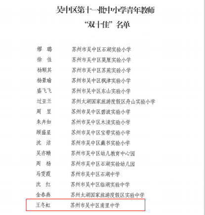 近日,吴中区第十一批中小学青年教师“双十佳”评选结果公布,beat365中国唯一官网王冬虹老师喜获吴中区中小学青年教师“双十佳”。