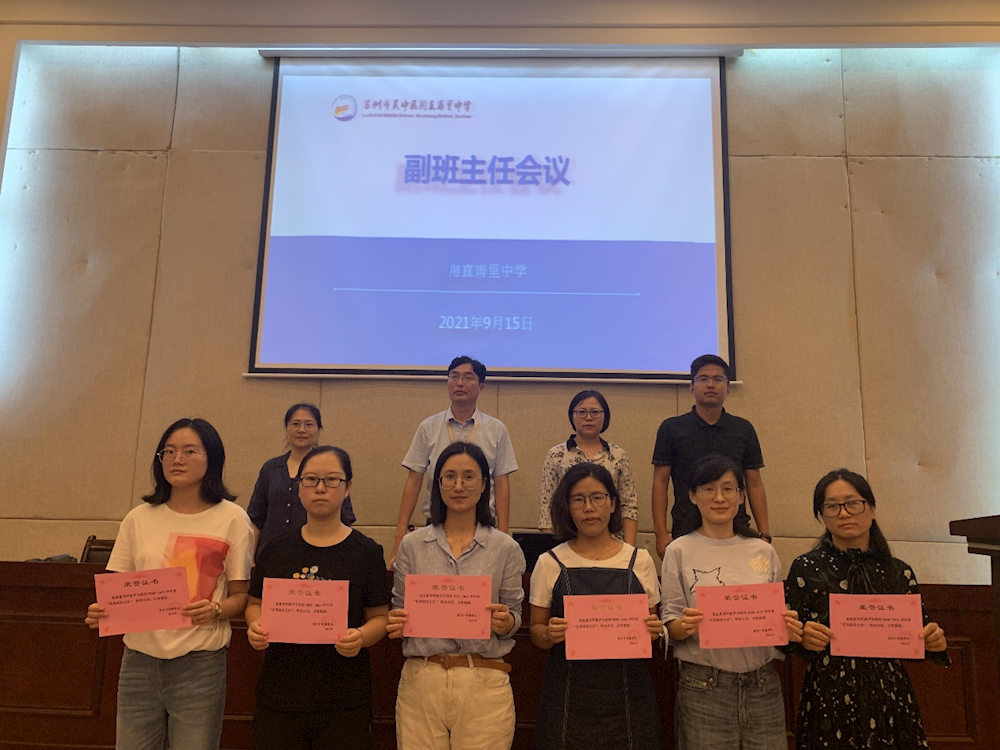 会议第一项议程,凌主任宣读2020-2021年度优秀副班主任名单,由陈校长为优秀副班主任颁发奖状,并感谢他们一年的辛勤工作。随后,陈璐老师作为优秀副班主任代表发言,分享了她作为副班主任的心得与收获,与会老师深受启发。