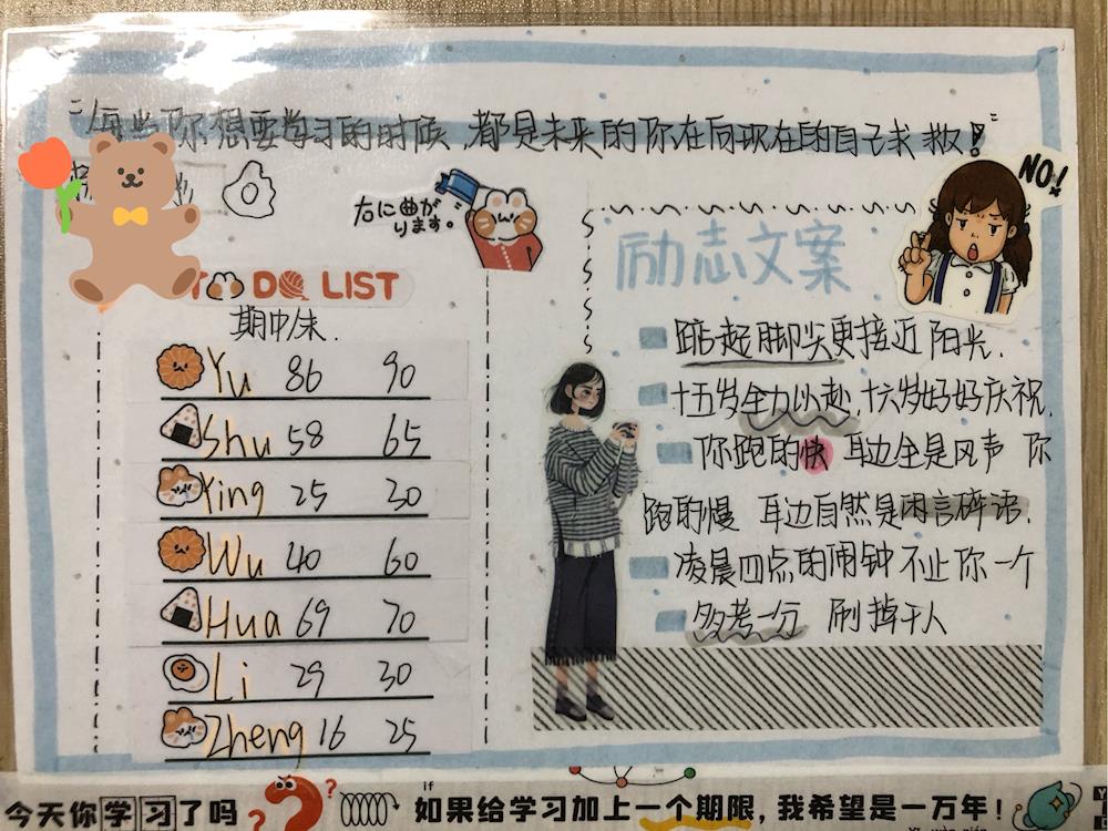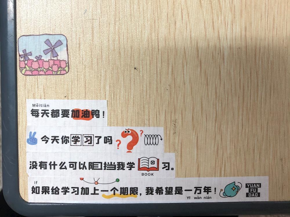 有的同学将励志语粘贴在课桌上,时刻激励自己。