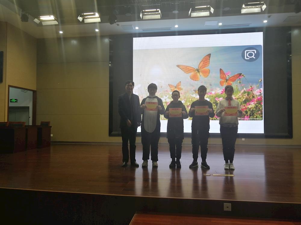 九个班级表演完毕,两位主持人上台进行总结,并公布了令人紧张的课本剧表演成绩,其中,一等奖四个班级:初一(6)班,初一(11)班,初一(14)班以及初一(18)班;二等奖两个班级:初一(9)班和初一(3)班;三等奖三名:初一(1)班,初一(12)班和初一(16)班。奖项公布之后,开始进行颁奖仪式。陈龙生校长给每位班级学生代表颁发奖状并合影留念。领完奖项之后,全体演员与老师进行大合照。