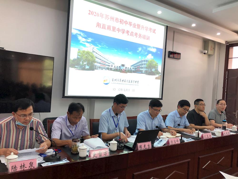 7月12日下午,二楼会议室举行了考务培训会议,出席会议的有甪直镇社会事业局文教科顾洁锋科长、教育局督导科沈玉方科长、甫里中学校长陈龙生、越溪中学领队史雪方副校长、长桥中学领队朱魏强主席、甪直镇人民医院防疫科顾卫林科长、甫里中学教务处主任陆林泉、越溪中学和长桥中学的监考老师及本校考务工作人员。本次工作会议由考点主任陈校长主持,副主任陆林泉对工作人员进行了考务培训。陈校长在会上也对监考人员提出了要求,要求监考人员履行好自己的职责,服务好考生。