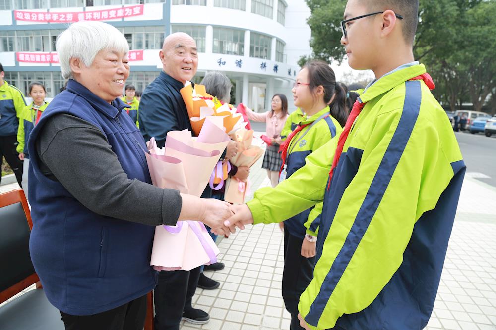 11月2日,甫里中学邀请到了来甪直寻根访祖的叶圣陶家人,他们是叶永和老师,叶小沫老师和蒋燕燕老师。刚一下车,热情的同学献上鲜花,为他们带上红领巾,鹤发童颜的老者,生机勃勃的少年,同框留下美好瞬间。